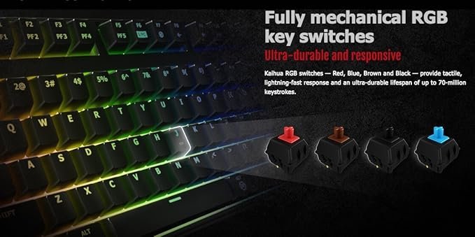 - Fully mechanical key switches for lightning-fast response and outstanding durability, RGB illumination with seven pre-set lighting effects